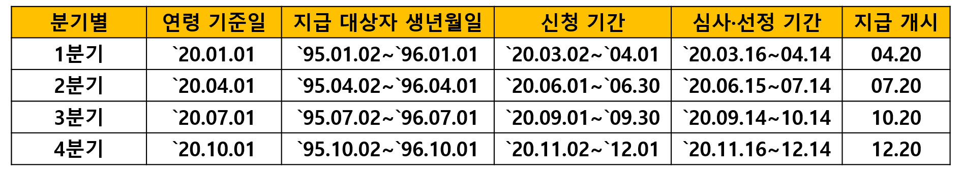 매분기별 25만원씩 4회 지급되며 연간 최대 100만원을 경기지역화폐의 형태로 지급합니다. 3년 이상 경기도에 주민등록을 두고 계속 거주하거나 합산 10년 이상 주민등록을 두게 된 경우 신청이 가능하고 소득 등 자격조건에 관계없이 기본조건만 만족하면 됩니다. 2020년에는 15만명이 지원을 받으며 소요예산은 약 1,506억원으로 도비 70%, 시군비 30%로 책정되었습니다.