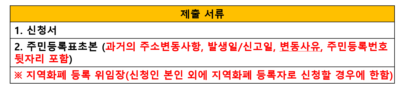 신청방법은 온라인 신청이 원칙이며 모바일로도 신청이 가능합니다. 제출서류는 신청서와 주민등록초본만 제출하면 되고 주민등록 초본의 경우 신청기간 내에 발급한 것만 인정이 됩니다. 주민등록초본의 경우 자신이 3년 이상 거주자라면 최근 5년 치 주소변동사항을 또는 합산 10년 이상 거주자라면 전체 주소변동을 포함해야합니다.