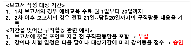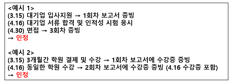 여기서 이전 월과 동일한 내용의 구직활동은 증빙서류가 같더라도 보고서 작성 대상 기간이 포함되어 있으며 인정됩니다.