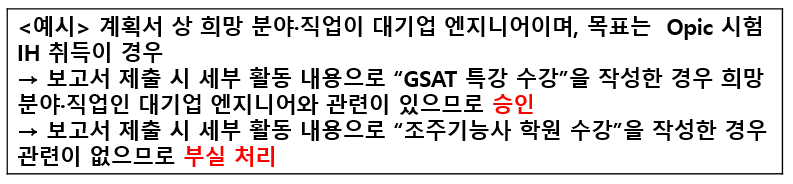 다음은 직·간접적인 구직활동 인정범위에 포함되는 활동을 해야 인정됩니다. 예를 들어, 구직활동을 못한 사유, 학사 편입 준비, 단술 물품·서비스 구입, 단순 체력 증진을 위한 물품 구매 등은 인정이 되지 않고 부실 처리됩니다. 또한, 구체적인 내용을 확인하기 어려울 경우 부실 처리됩니다.