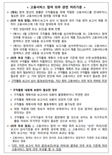 ○ 담당자는 아래의 “고용서비스 참여 의무 관련 처리기준”에 따라 구직활동 보고서 심사 시 고용서비스 참여 의무 이행 여부를 확인하고, 필요할 경우 다음 회차 고용서비스 참여 의무를 부과