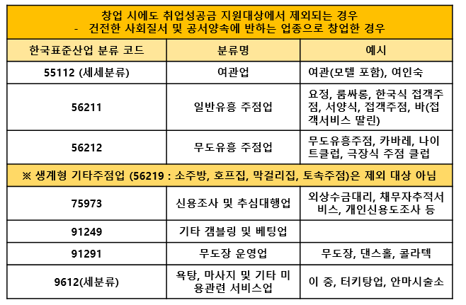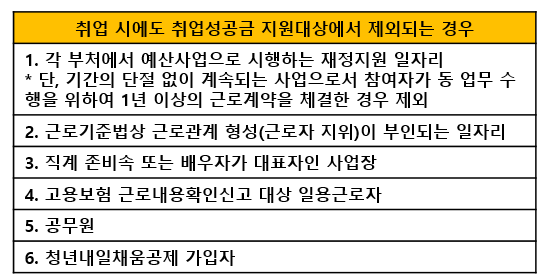 ① (취업의 기준) 1) 주 근로시간이 20시간 초과하고, 2) 고용보험 취득 시, 정규직, 비정규직 여부와 상관없이 취업으로 간주하나, 아래와 같은 경우는 취업 시에도 지원 대상에서 제외