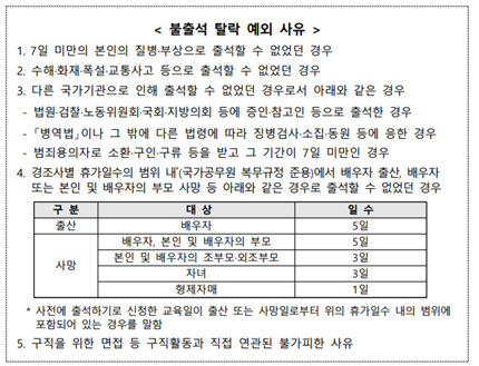 □ (불출석 처리) 교육 당일 불출석 시 탈락 처리하되, 예외적으로 아 래와 같은 사유로 불출석한 경우, 1회에 한하여 교육 재신청 허용 (단, 당월 예비교육 회차 및 정원에 여유가 있는 경우에 한함)