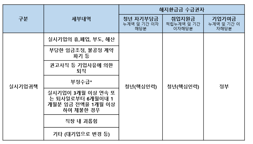 ** 단, 청년(핵심인력)의 사망, 업무상 재해 등 불가피한 사유로 중도해지 시 기업기여금은 지급하며, 중도해지 환급금은 해지시점까지 적립된 적립금 ‘전액’으로 한다.